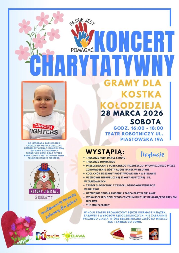 Koncert charytatywny Gramy dla Kostka Kołodzieja organizowany przez wolontariuszy „Fajnie jest pomagać”. Zapraszamy 28 marca 2026 roku między 16:00 a 18:00 do Teatru Robotniczego im. Teodora Mierzei w Bielawie. Wystąpią dwie grupy Poloneziaków z programem dolnośląskim.